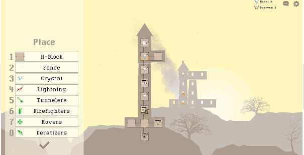 房间的摆放也很有讲究,越高力量就越强,相对于较矮的房间有绝对优势。但同时处于高处的房间要小心被闪电击中,闪电能让塔着火,几个回合内就能让塔倒塌,所以要让矮人救火员时刻做好准备。还有一些房间更适合放在地底,还也会收到洪水的威胁。