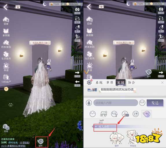 双人动作触发途径:进入好友家园,选中好友模型,点击下方动作,然后滑到最底下就能看到双人动作了