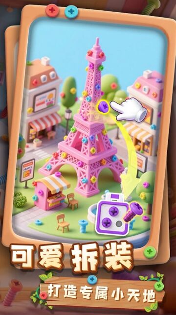 1. 以微信为载体的轻量休闲小游戏,核心围绕拧螺丝拆解各类物件展开,玩法核心聚焦解压与趣味探索。