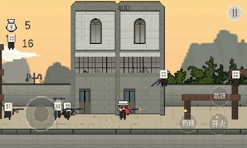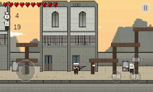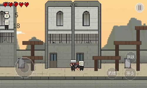 2. 单摇杆模式下,左下区域控制角色位移,右侧按钮分别对应跳跃、射击与投掷金币,左上角实时显示血量与钱袋数量,新手需优先熟悉各按钮功能。