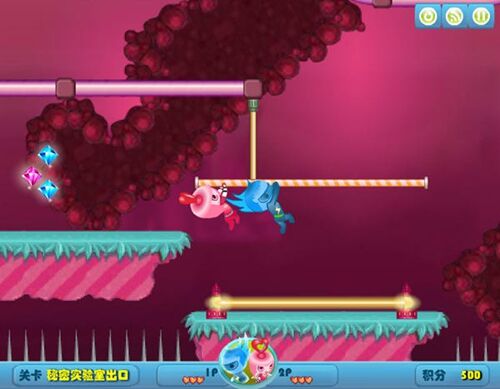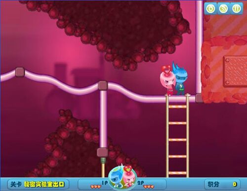 游戏以实验室逃亡为核心主题,讲述了正义双星闪与翼被邪恶博士球球囚禁后,相互配合逃离实验室的故事。玩家将分别操控蓝色角色闪和粉色角色翼,两人拥有不同的技能成长路线,需在闯关过程中逐步解锁。游戏共有八个常规关卡与隐藏的修罗场关卡,每个关卡都设有独特的机关、敌人和谜题,从秘密实验室出口到自恋蛙的巢穴,场景逐步切换,难度循序渐进。游戏设定简单易懂,无需复杂操作,核心亮点在于双人协作,只要有一位角色死亡,便需重新开始关卡,极大提升了游戏的协作性与挑战性。