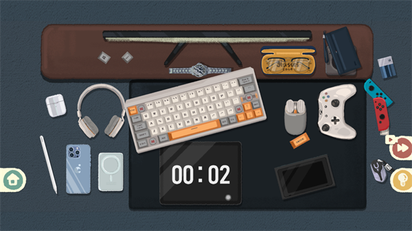 2、第二关把四个键帽装到键盘正确的位置上,眼镜放到盒子里,把游戏机两杯的手柄安上。