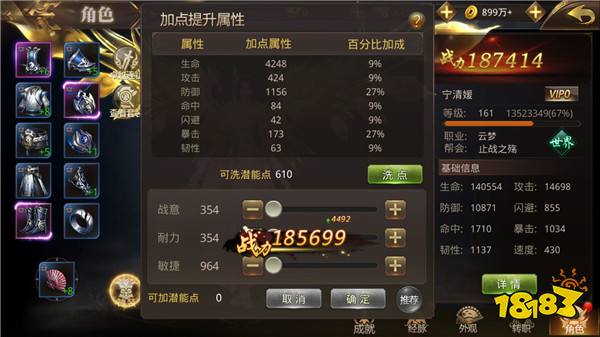 角色每提升1级,就能获得10潜能点,可以自由分配在战意、耐力和敏捷上。其中战意加点影响角色的攻击和命中,耐力加点影响角色的生命、闪避和韧性,敏捷加点影响角色的防御和暴击。三大属性分别影响角色不同维度的成长,因此想培养什么样的角色,就看各位的自由发挥了。
