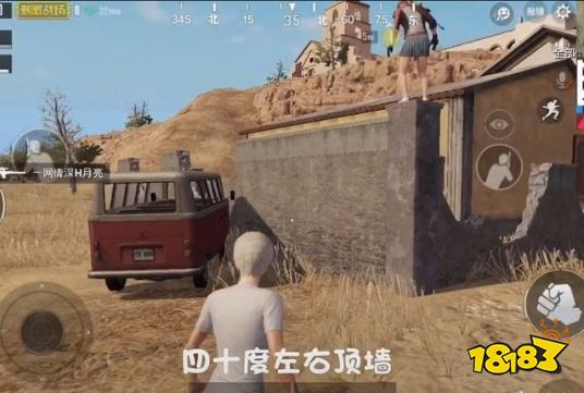 第一步,我们先找到一辆载具,然后把载具的车头以40°左右的角度顶墙。然后让一个队友以下图的方式,趴在墙上。