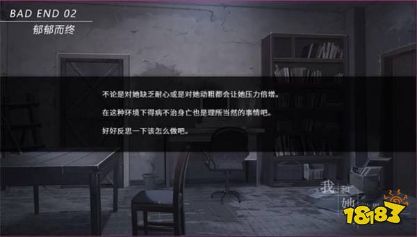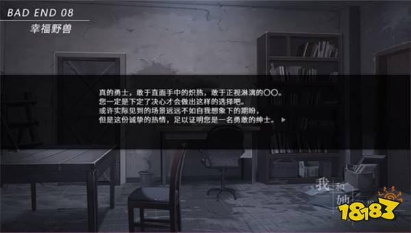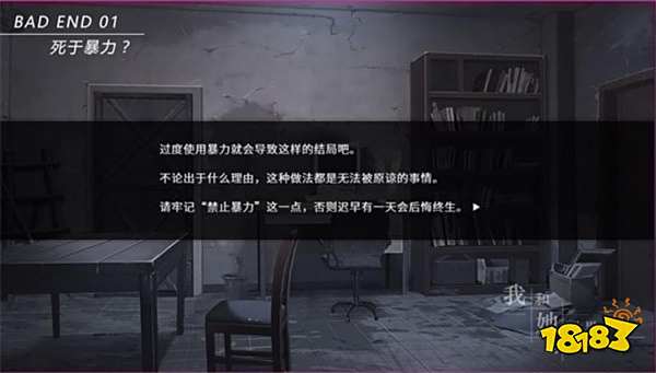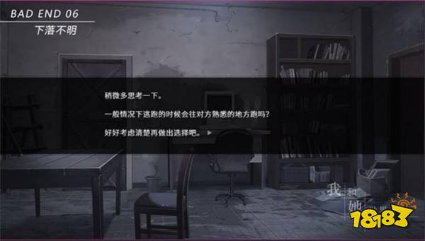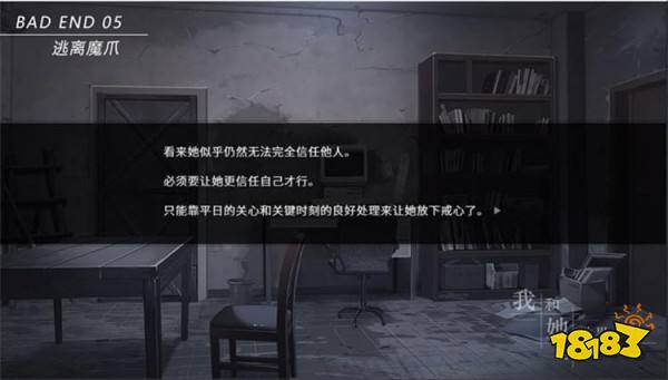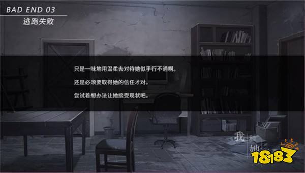 达成条件:第二章结尾选择克制不推女主进入3A线路,第三章出现“食物减少事件”剧情后,女主会发现所谓的救援是骗局,准备逃跑。如果在此后的剧情中(仅一次选项)信任度不足,则男主发现女主受伤后回去拿医药箱时会彻底跑掉,进入此BE。