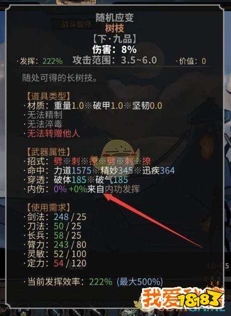 内功和食物还有宝物既然有加内功发挥那么就有减内功发挥的,但是武器只受到加值的影响!也就是说一把固定为50%内伤的武器,是不可能变成高外伤武器的,只能变成高内伤武器。