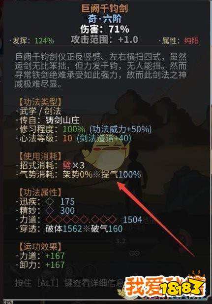 首先我想说明一下一个功法造成伤害的比例就是消耗的架势和提气的比例(下图的第一个箭头,正常情况下大家的巨阙都是打纯外伤对吧所以消耗的100%架势)