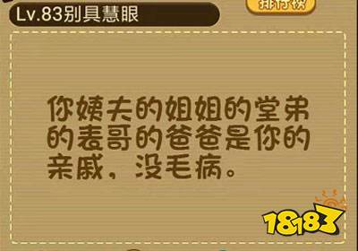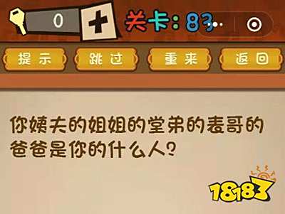 有很多的小伙伴们都想知道你姨夫的姐姐的堂弟的表哥的爸爸是你的什么人最强大脑大乱斗83关答案是什么,下面为大家带来详细的答案介绍,快来一起看看吧!
