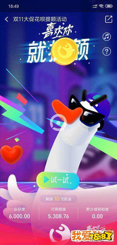 2.每一个人有10次机会,有可能提几百到上千的花呗额度,到双11那一天在淘宝中购买商品就可以使用这个临时额度了;
