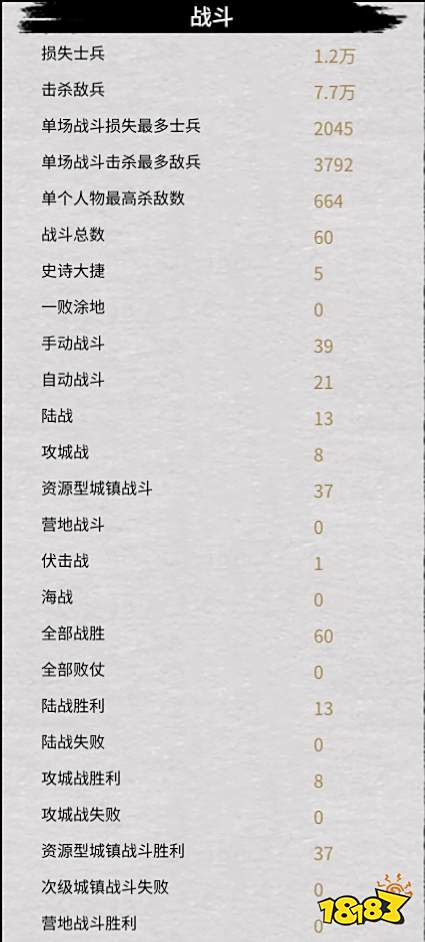 首先看下战斗统计,很明显要速通大部分战斗都要手动,包括攻城战。自动一般就是最后收尾时用用,有攻城车哪怕对面不出依然可以打出比自动更好的战损,而低战损决定你外交态度,续航能力等各方面。