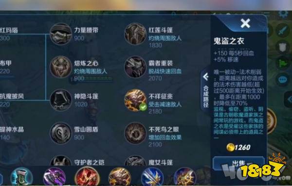 新增装备是鬼盗之衣,这是一个远程法师的噩梦,这件装备和魔女一个价格,不过跟魔女的用处相差甚远,这件装备没有血量加成,法抗和魔女一样,回血效果又比霸者的高,还增加一些移速,光基础属性来看已经是一件非常综合的装备了。