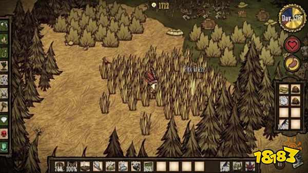 进入游戏先不要急着想自己该干什么,先来认识一下饥荒的游戏界面。先看游戏的右上角,齿轮加指针的那个圆形代表着时间,这个游戏即使你什么也不干,时间也会不停的流逝,三种颜色分别代表着白天、傍晚和夜晚三个时间段。特别要注意的是,如果人物处于完全没有光线的地方,会受到查理阿姨的攻击,所以晚上记得要生火。