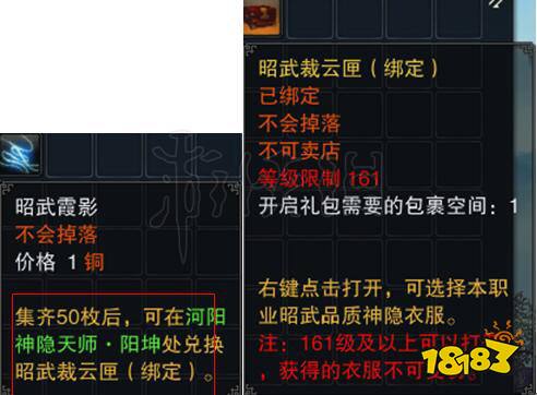 ①【昭武裁云匣】为礼包道具,开启后可选择本职业昭武衣服。