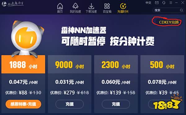 雷神NN加速器是目前市面上最可靠的加速器之一,在我们40407网站上,不止提供了加速器的下载,还有CDKEY能兑换相应的免费使用时间!