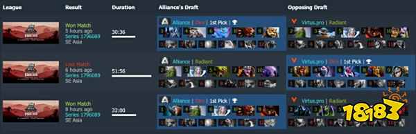 作为VG在败者组第三轮的对手,Alliance在今天的第一场比赛中以二比一的比分战胜了VP。那个BO3,虽然epileptick1d的小鱼人在第二局给Alliance制造了巨大的麻烦,不过在其余两局比赛中,Alliance都赢的轻松惬意——第一把,带着猛犸BUFF的血魔从头杀到尾,Nikobaby将比赛变成了自己的个人秀;第三局,趁NoOne的炼金还在刷辉耀的时候,Limmp的Puck带领队伍发动了数波致命的袭击。有一说一,炼金是把自己的装备刷出来了,但他的四个队友却都混的很不如意。中期团战,NoOne双拳难敌四手。30分钟,Alliance锁定胜局。