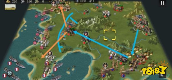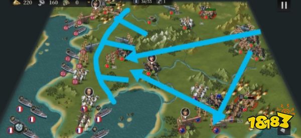 陆军优先打击岸边的火炮单位;第三回合敌方第一波增援出现;占领港口后第二波增援出现;