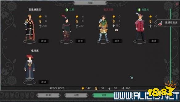 可以在盟友界面查看所有盟友和潜在盟友,红色表示无法加入成盟友,绿色是盟友,白色是中立,拉拢盟友的方法很简单,完成他们的任务就行了,而且,他们的任务往往相互冲突,大多数情况下只能在两个领主中选择一个。