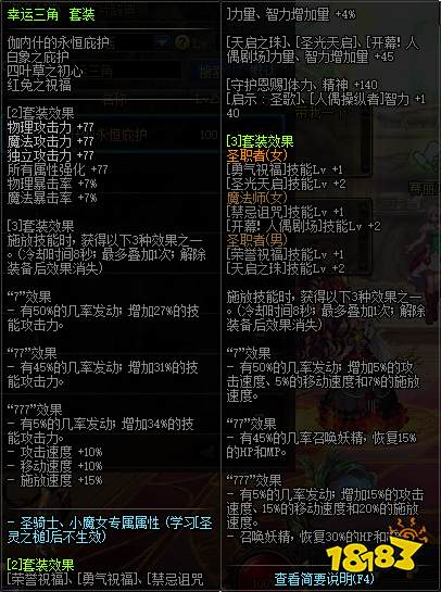 总结在伤害提升的角度毋庸置疑一般情况下777首饰是伤害最高的那一套,但有财力的话一般来说更推荐黎明时分(大恍惚),少量的伤害差距带来大量的cdr和稳定的三速。