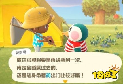 小编被蜜蜂蜇伤了,但是没有药的手册,跟企鹅花寿司(你岛上的女村民)对话,它看到我们脸上的伤,就给了药的手册我们