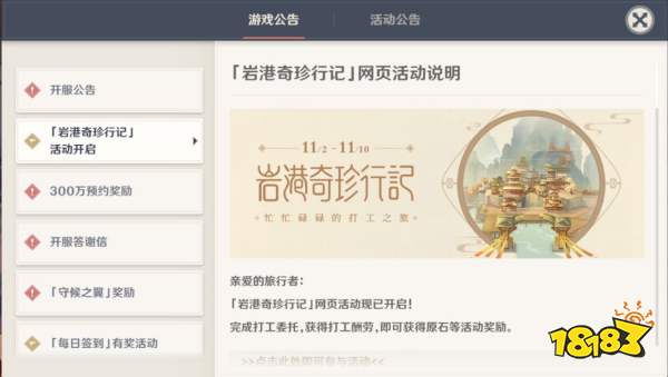 原神岩港奇珍行记玩法活动怎么参加?如何完成岩港奇珍行记的内容?原神在今天又开启了一个新的活动。每一位玩家化身为打工人。在游戏中四处寻找工场打工。完成打工内容后会获得酬劳跟奖励。下面就来告诉大家快速玩法任务的方法。