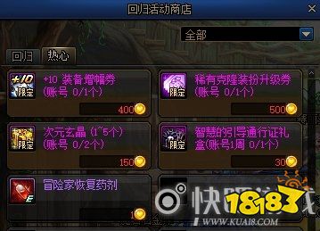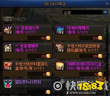 同回归玩家组队通关推荐地下城和特定地下城获得的热心硬币可以用于兑换+10装备增幅券、稀有克隆装扮升级券、次元玄晶礼盒、智慧的引导通行证礼盒和冒险家恢复药剂等物品。