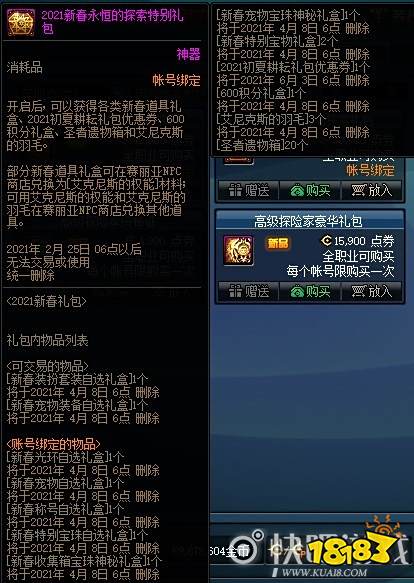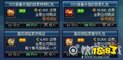 1月21日维护更新后,玩家可以在商城中使用点券购买2021春节套礼包。春节套礼包有两种,分别是42900点券的特别礼包和39900点券普通礼包。