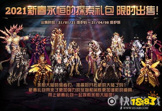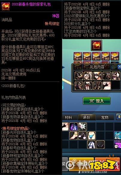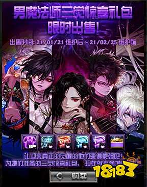 礼包于1月21日维护更新后上架,内含神圣克隆装扮套装、男魔法师人气装扮套装、男魔法师迷你二觉宠物、时间引导石、升级券等物品。
