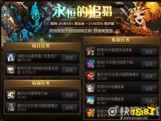 玩家在永恒大陆中制作装备、通关推荐地下城和指定地下城可完成相关活动的任务。任务完成时,即可在相关活动的页面中手动领取奖励。