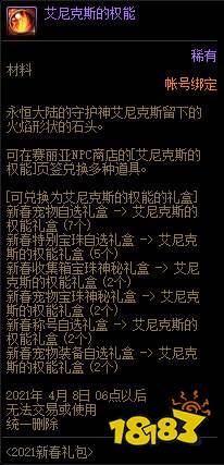 2021春节套礼包中的新春宠物自选礼盒、新春特别宝珠自选礼盒、新春收集箱宝珠神秘礼盒、新春宠物宝珠神秘礼盒、新春称号自选礼盒、新春宠物装备自选礼盒等道具均可兑换为艾尼克斯的权能。