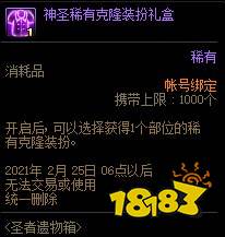 圣者遗物箱中将限时加入新春强化/增幅大礼包、神圣稀有克隆装扮礼盒和神圣稀有克隆装扮套装礼盒。