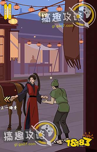 下一场景用剪刀在门洞上剪下布,并拿到毛笔。