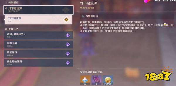 畅畅这时从远处跑来,想让望雅编制一个霄灯给她玩,请旅行者从港口的建筑工地上帮忙拿一些编制霄灯的材料。当旅行者和派蒙到达建筑工地时,却发现有一个鬼鬼祟祟的人蹲在材料旁边,旅行者上前询问他却直接离开。察觉到事情不对劲的派蒙和旅行者在附近搜索了一会,觉得这个人肯定是来给海灯节捣乱的,并在向望雅提交材料的时候提出了这件事情,望雅让旅行者去总务司报案,并表示自己也会留意。