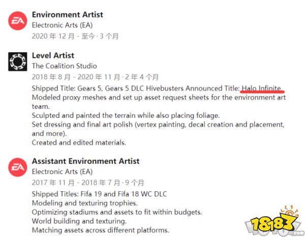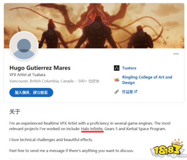 如果说这位开发者的个人资料出现《光环:无限》可能是个意外错误,但是另一个开发者的简介中同时也提到《光环:无限》让事情变得可信了起来——此前曾担任《战争机器》团队The Coalition视觉特效师的Huge Gutierrez Mares在自己的履历中也提到了《光环:无限》。