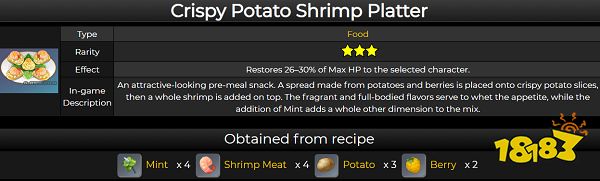 使用之后能够恢复百分之26-百分之30的最大生命值,需要四个薄荷+四个虾仁+三个土豆+两个树莓制作而成,是一道非常诱人的餐前小食,回血的效果还算可以,并且材料都比较容易搜集。