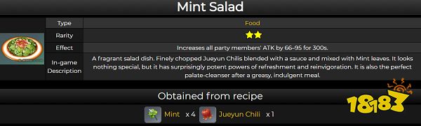 能够增加全体队伍角色66-95的攻击力,且持续300秒,需要四个薄荷和一个绝云椒椒制作而成,口味芳香的凉拌菜,拥有着令人振奋的惊人潜力,让笔者奇怪的是,为什么一个辣椒和一个薄荷能够在一起,还能制作一个薄荷莎拉,你确定不是黑暗料理吗。