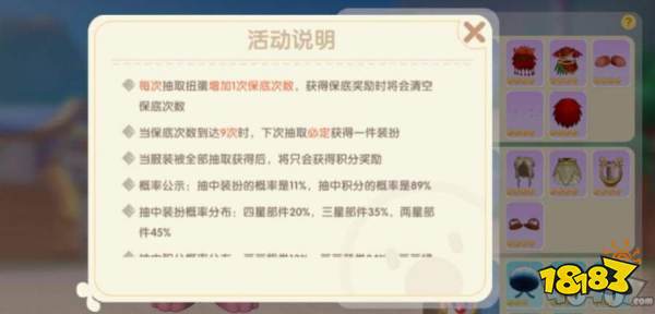 小结:总的来说扭蛋机的概率并不算高,但是10抽一保底的概率还是非常不错的,不过因为保底也是随机品质的装扮,因此想要获取自己所需装扮还是需要非常多投入的。