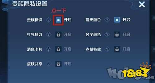 第三步:在弹出的贵族隐私设置窗口中,贵族标识代表的就是【贵族等级】,点击一下就能取消开启的选中状态,届时无论是组队界面还是加载界面,别人都看不到你的贵族等级了。