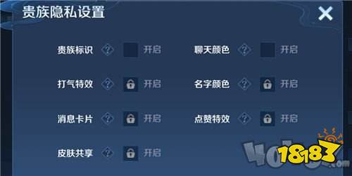如果你想隐藏【聊天颜色、名字颜色、皮肤共享、打气特效、点赞特效、消息卡片】的特权,以同样的方式取消选中状态,就能全部关闭显示了。(PS:这些特权会根据贵族等级解锁,贵族等级低于要求默认锁定。)