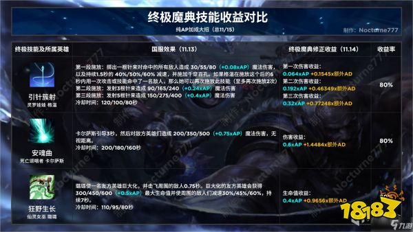 纯AP加成的技能比较多,有18个。最特殊的就是艾希的大招魔法水晶箭。正式服的魔法水晶箭有着100%的法术强度加成,但在终极魔典被修正到了只剩下30%,但如之前所说,纯AP加成的技能会被添加额外AD加成,这个技能的加成也仅有72.62%额外攻击力,是这个模式所有40个大招里面收益率最低的大招。对纯AP加成的大招来说,大部分大招在终极魔典里享有相当于正式服80%数值的AP加成值,同时还会加上新加成241.4%数值的额外AD加成。同样打个比方:安魂曲的伤害加成为75%的法术强度,在终极魔典中被修正到原来的80%,也就是60%,然后再加上新加成,也就是60%的241.4%的额外AD加成,这个技能的加成就变成了60%AP+144.84额外AD。但是,冰封陵墓(丽桑卓)、木乃伊之咒(阿木木)和群鸦风暴(费德提克)的收益率仅为60%,奥术仪式的收益率在经过一轮测试后表现不佳,从80%的收益率变成了90%。这个收益率只针对原加成而言,新增的额外AD加成只需要在计算收益率之后乘以241.4%即可。完整的收益率见下图。