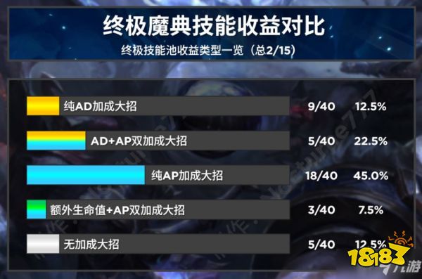 接下来是本篇文章的核心,也是容易引起疑问的地方。“如果我是一个AD英雄,但是我选到了一个AP伤害加成的大招,那我选的这个大招是不是只有基础伤害了?”很负责任地告诉你:不是。如果你选的大招是一个AD加成的大招,那么它会添加一点AP加成;如果你选的大招是一个AP加成的大招,那么它会添加一点AD加成;如果你选的这个大招没有加成……那么它还是没有加成。为了给各位总结出伤害(或其他效果,下同)加成的规律,我统计了所有40个在随机库里的终极技能在国服当前版本(11.13)下的伤害加成,和当前在美测服(11.14)终极魔典模式下的特殊加成。