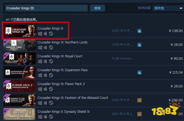 十字军之王3这款游戏在steam平台上的名称叫做Crusader Kings III。玩家进入steam平台后,在搜索栏中输入Crusader Kings III进行搜索,就可以在搜索结果中看到十字军之王3这款游戏的游戏本体以及DLC。
