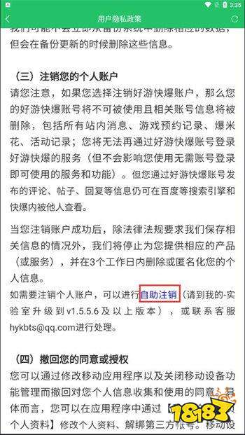 3、在用户隐私政策中下划,找到“注销您的个人账户”选项,选择其中的【自助注销】;