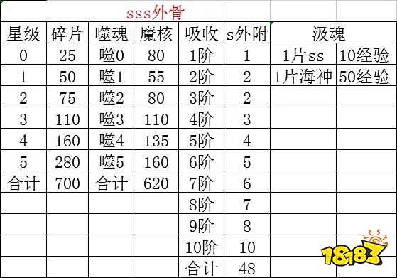 我们可以看到吸收有所改变,sss外骨吸收上限为10阶。吸收10阶由48%属性增长到了88%属性。且吸收增加攻击属性变为了吸收右爪。多了汲魂功能。sss外骨汲魂收益大于ss+吸收11-15阶。