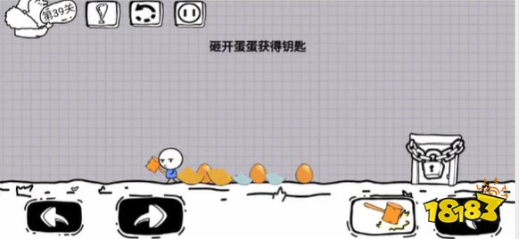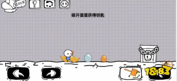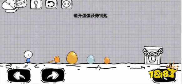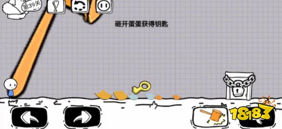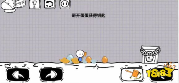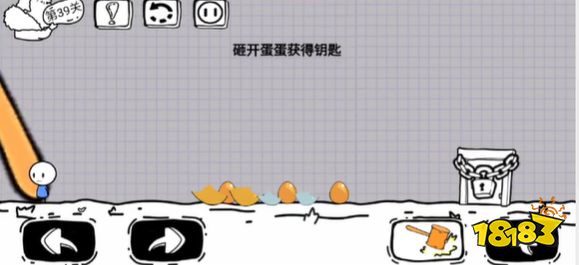 脑洞人大冒险第三十九关攻略:我们往前走,控制小人砸开最大的蛋,然后砸开第二个蛋蛋,里面还有一个蛋,三个蛋蛋都砸开就可以获得通关的的钥匙。