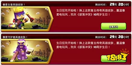 部落冲突像素皮肤获得方法:像素蛮王的皮肤可以通过参加挑战活动完成任务免费领取,其余的三款10周年皮肤是需要花费30元直接购买得到的,上架1个月。