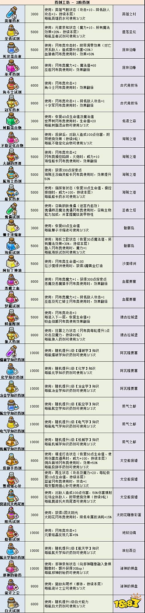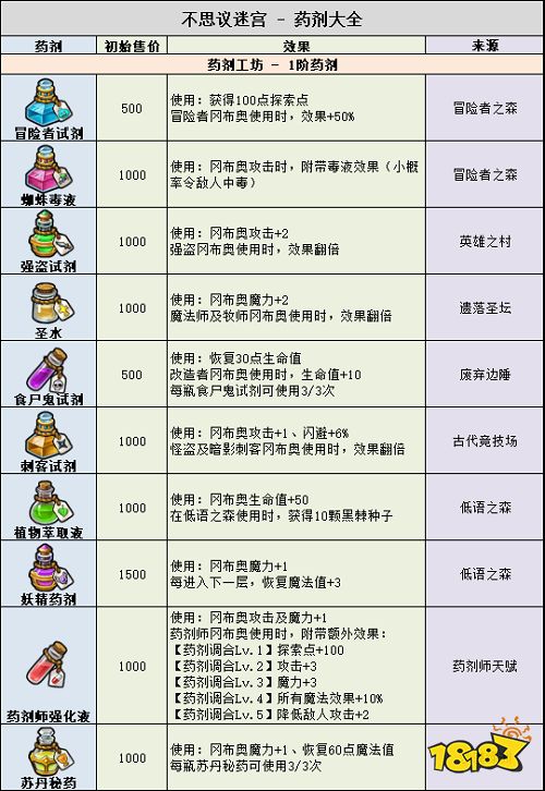 不思议迷宫药剂大全2022最新:9.9 更新加入:胜者之水、圣灵秘药、爆裂之酒、挑战者试剂、深渊恶魔之血、未来机械之心。