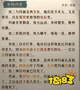 海龟蘑菇汤拒绝内卷攻略:本关核心关键词为鱼缸、餐馆、挑选、吃;答案-他俩是两条鱼,一条很肥一条很瘦,瘦鱼认为客人都会挑选肥的鱼吃,但是没想到餐厅会偷偷用不肥的鱼掉包。