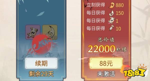 游戏中季卡稍微贵一些售价为88元,一经购买可以获得880个天命、每日登陆可以额外获得120个机缘、10个乾坤玉简和1个造化图,约等于22000机缘