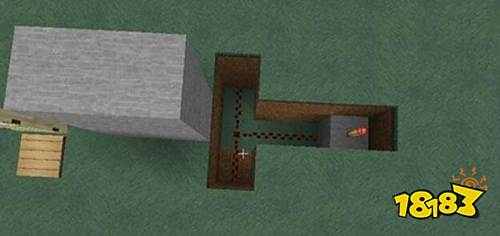 1、首先我们这样挖一个坑,T字型。两格深。然后在里面铺上红石电路。就像下图这样,右边的是一个石头和一个红石火把。