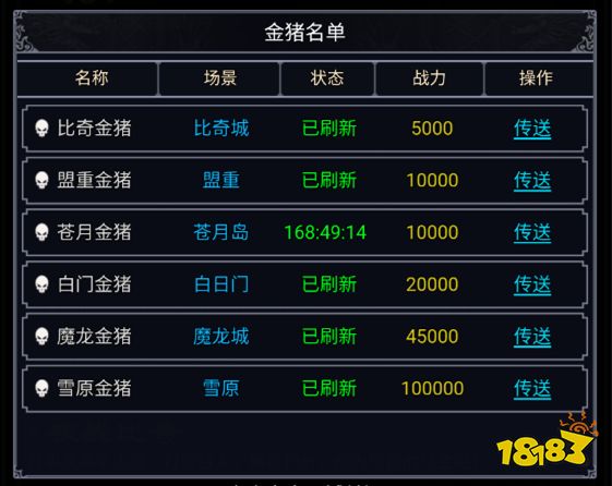 玩家选择想要击杀金猪,点击传送前往目标所在地图。所有地图都有最低战力需求以及推荐战力,具体战力需求如下图。